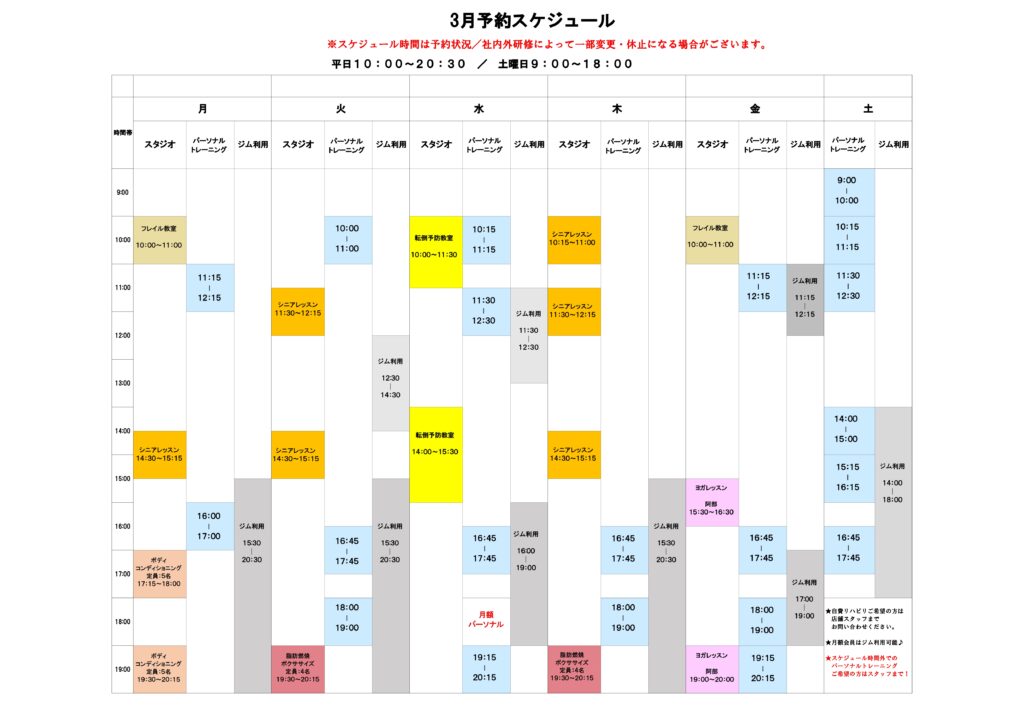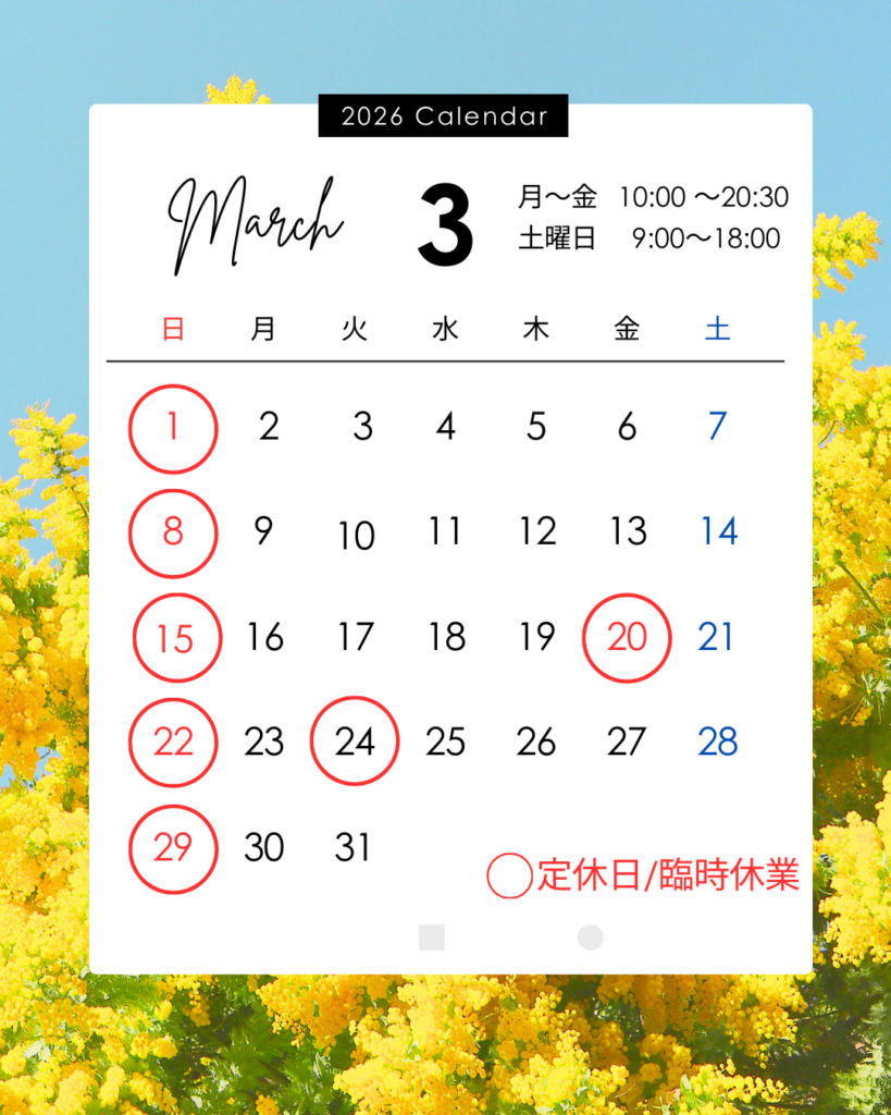 2026.02.19 S.P.F.G. ROAD 3月カレンダー&スケジュール 3/24(火)臨時休業となります。 体験・見学ご希望の際は、お電話・LINEでのご連絡をお願い致します。 ご連絡対応時間 平日 9:30~20:30 土曜日 8:30~18:00