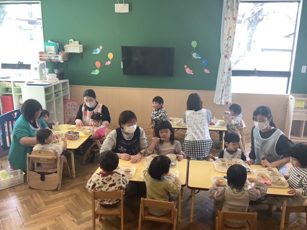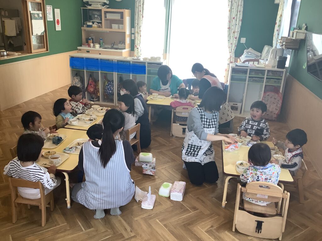 当園では、年次によって昼食時間が異なっていますが、今日は「1年間たのしかったね」の気持ちを込めて、みんなで昼食を食べることにしました。