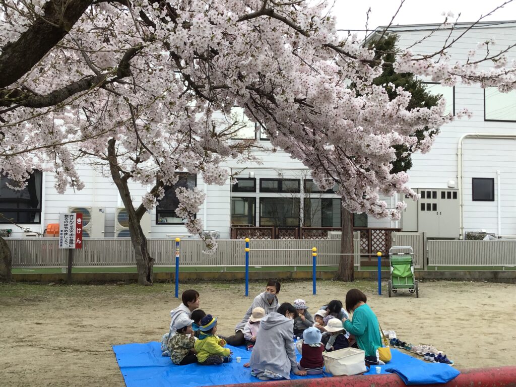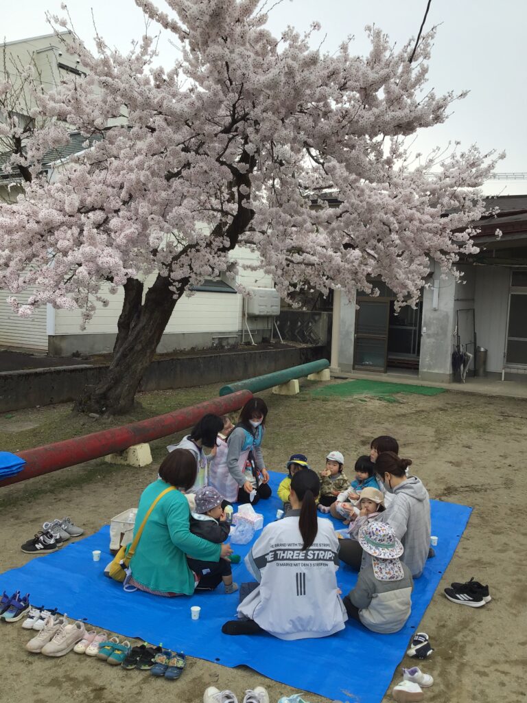 今日は公園にシートを敷いて、みんなでお花見をしながらおやつを食べました。