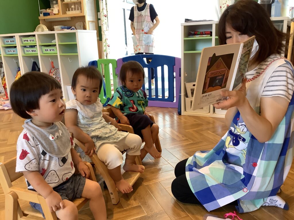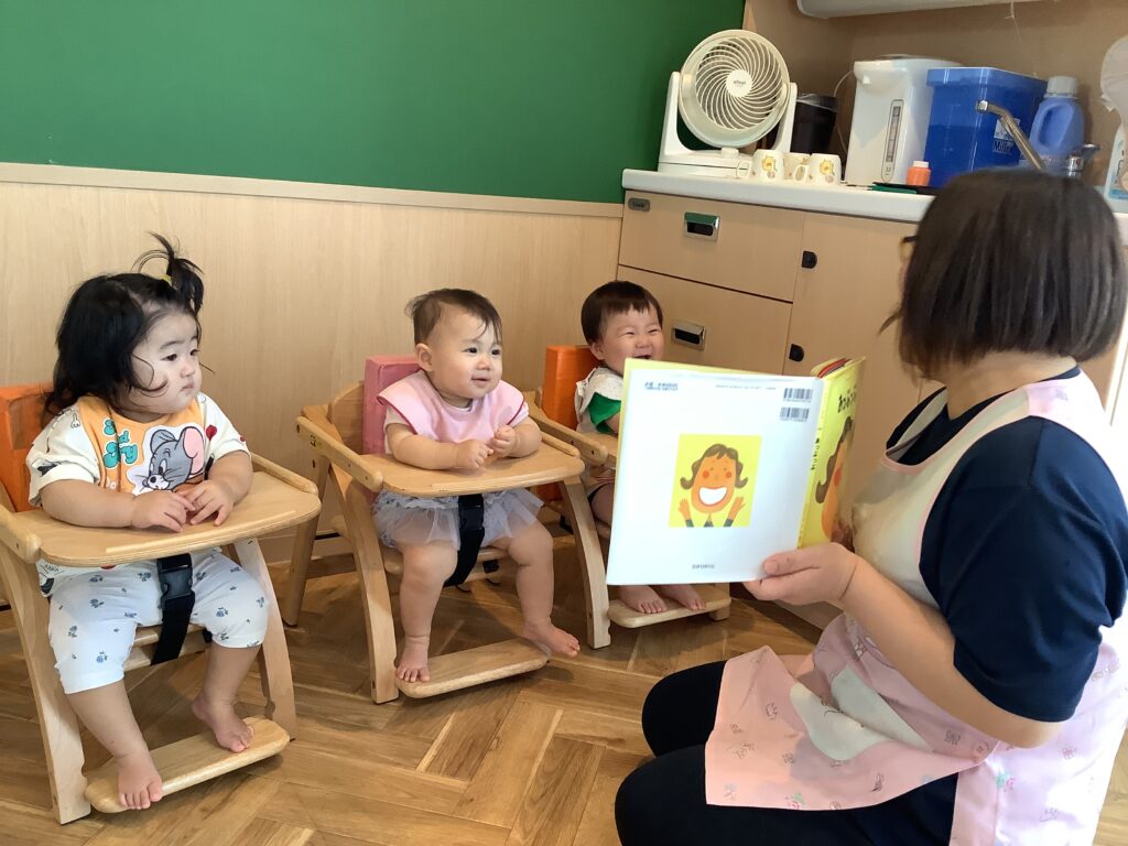 2025.08.04 やよい保育園 朝の会 午前おやつの時間が終わると、各年次毎に分かれて朝の会を行います。 絵本の読み聞かせや手遊び、これからの活動のお話など・・・ 一人ひとり先生の話を集中して聞いています。