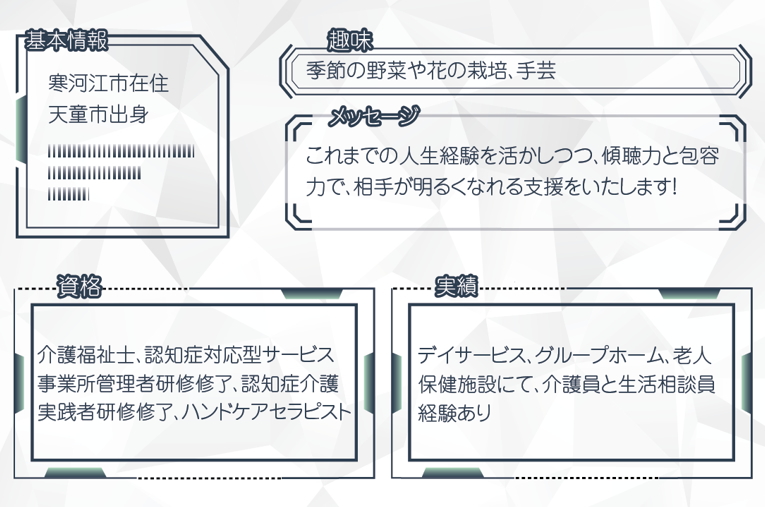 デイサービスなどの現場経験の知識を活かしながら、介護や福祉についての素朴な疑問から、介護サービスの導入相談、なんでもご対応いたします。