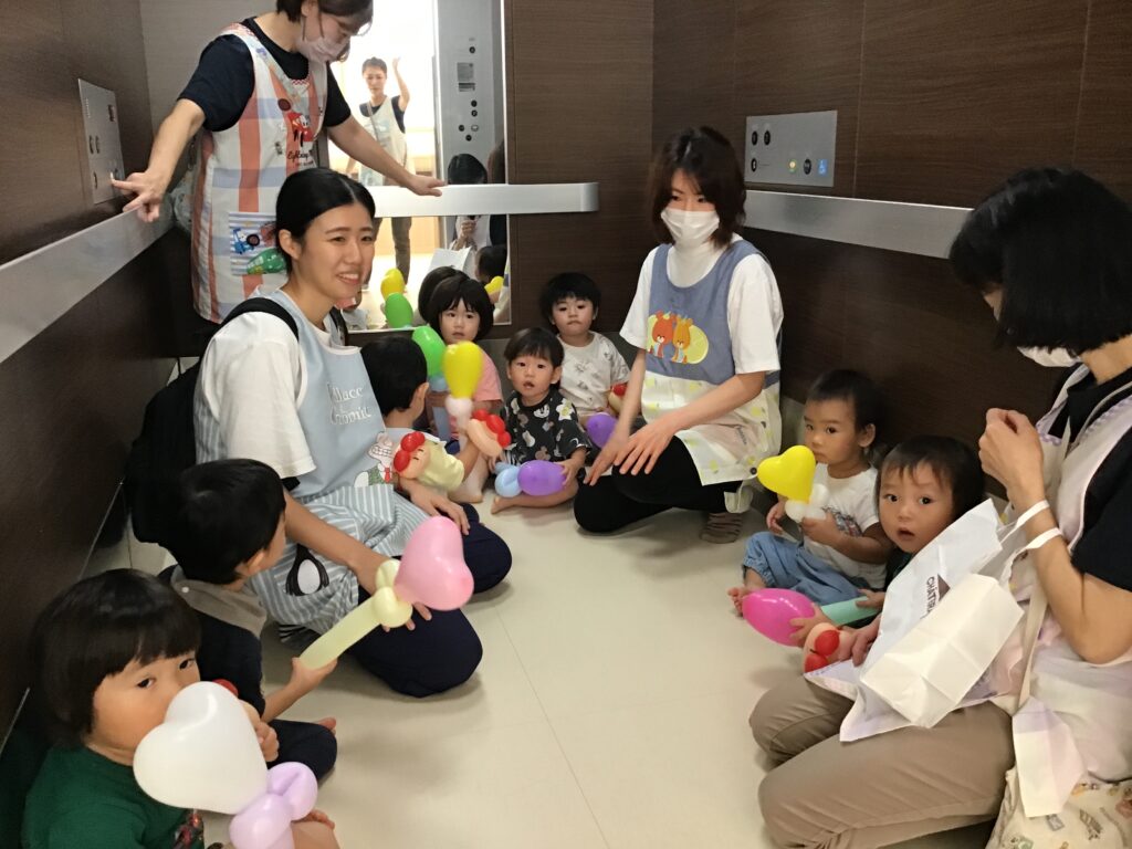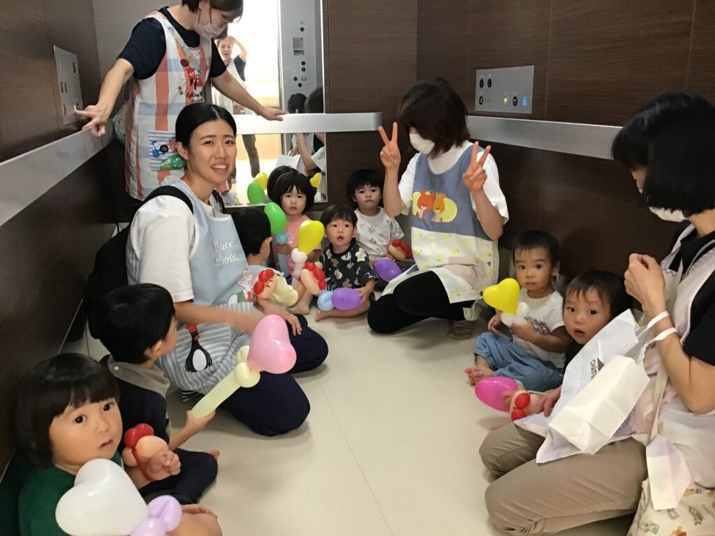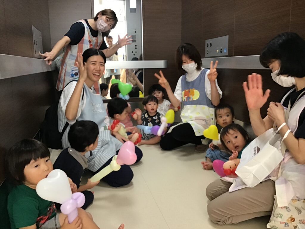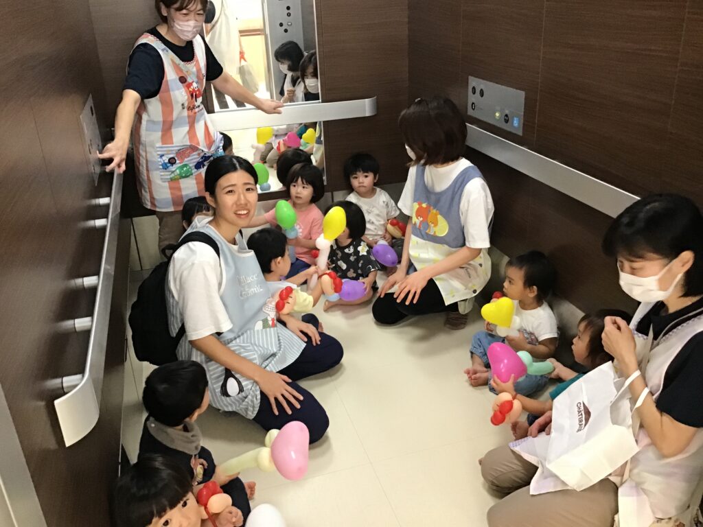大きいエレベーターに乗ると、「これから上に行くか、みんな座って~~~」と話すと、