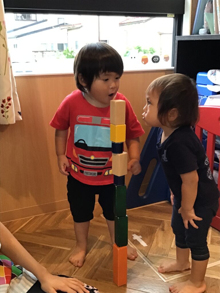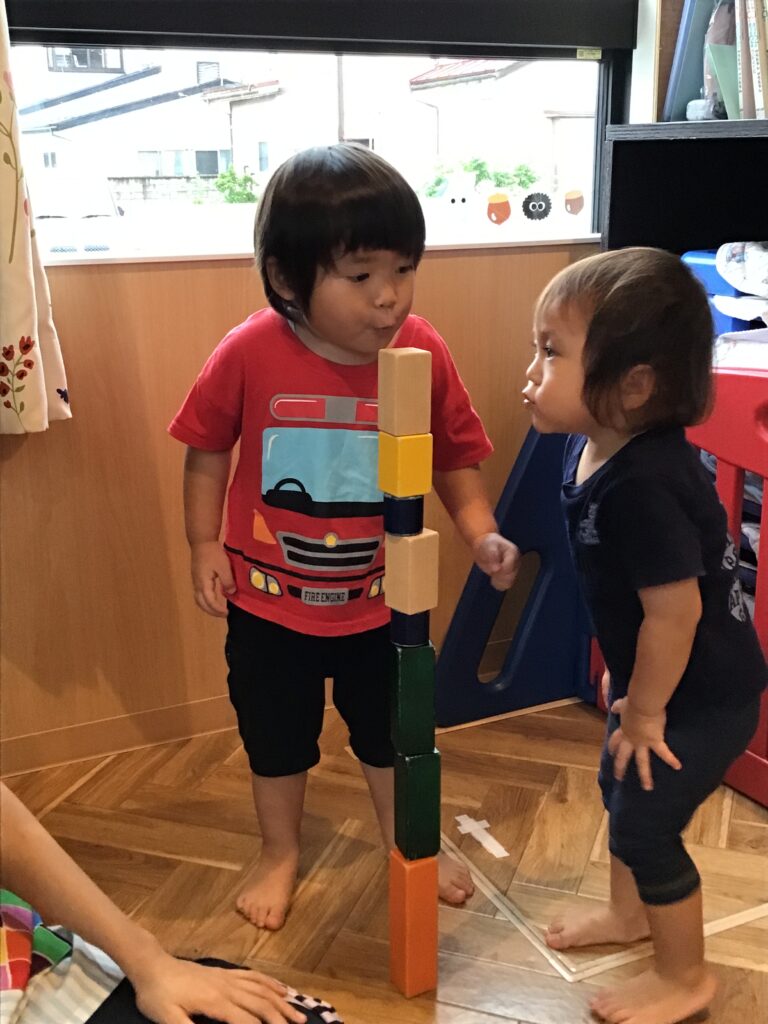 高く積んだ積み木を見て「ハッピーバースデートゥーユー」と歌いながら近づいてきた1歳児の○○君。