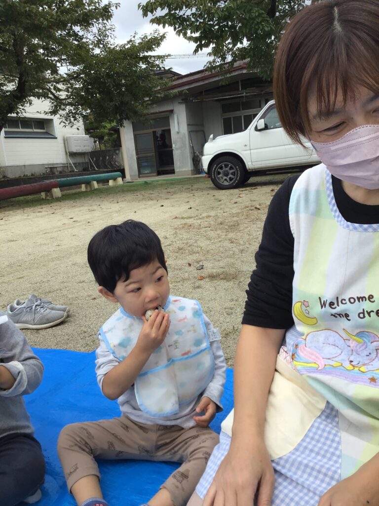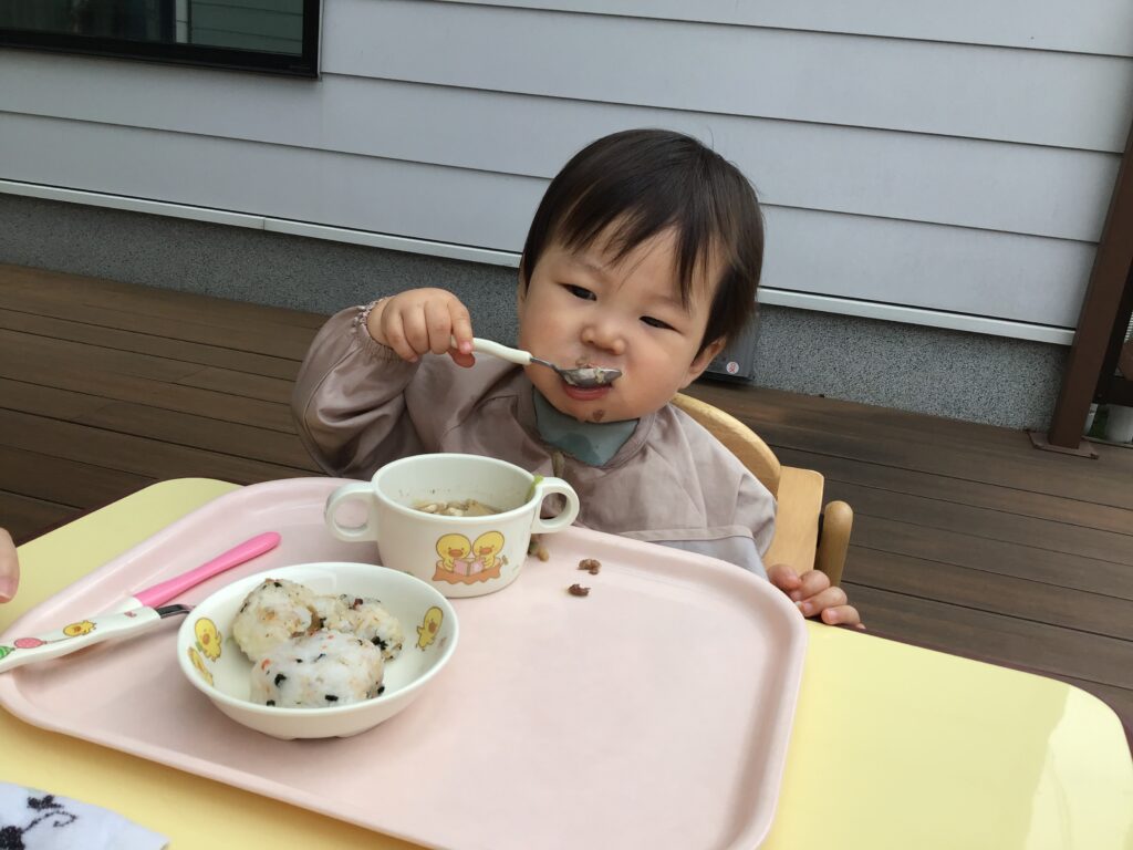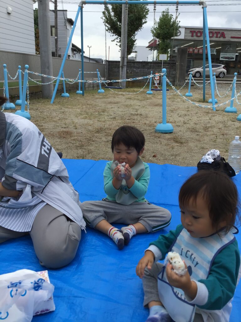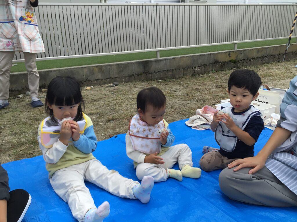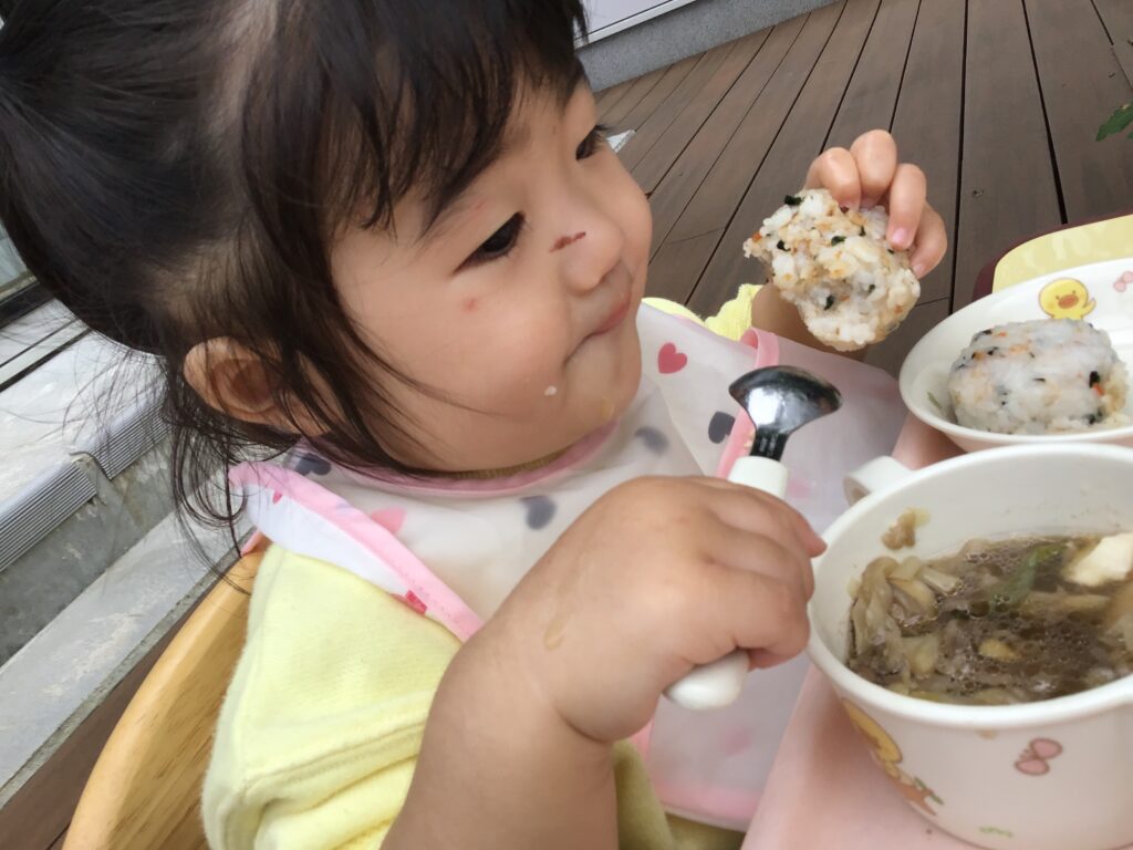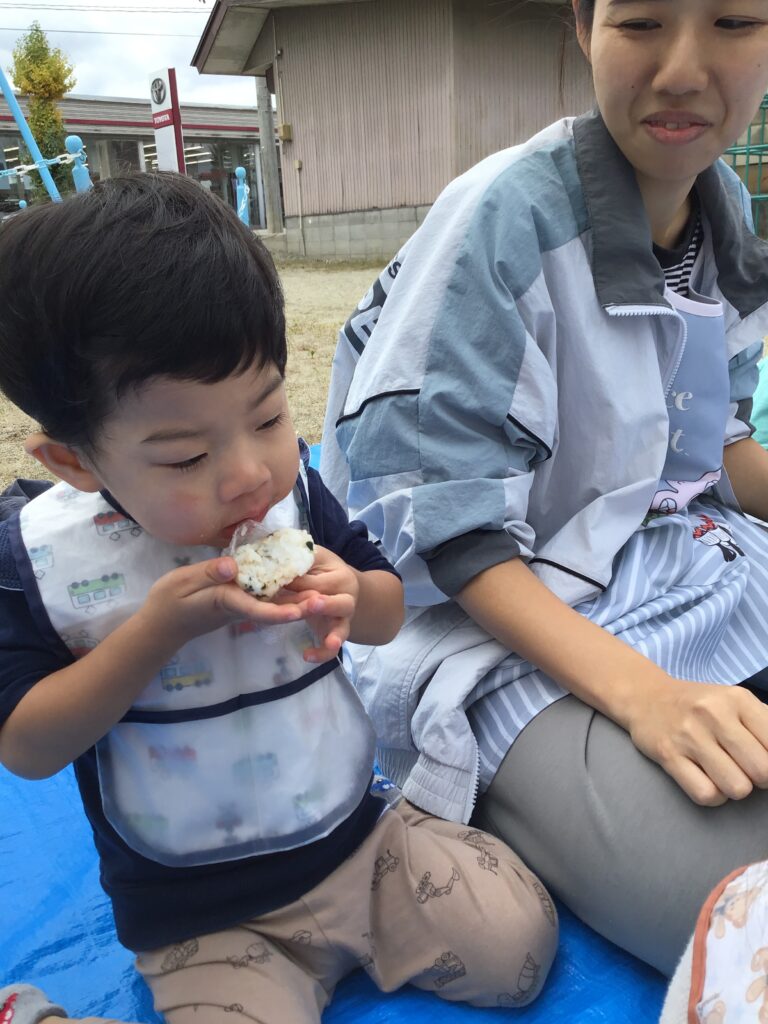 おにぎりもパクパク!お外で食べるのは特別おいしいね!