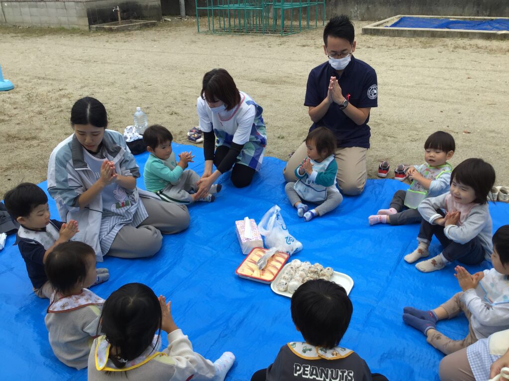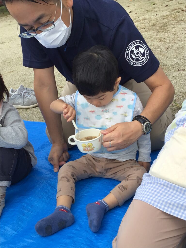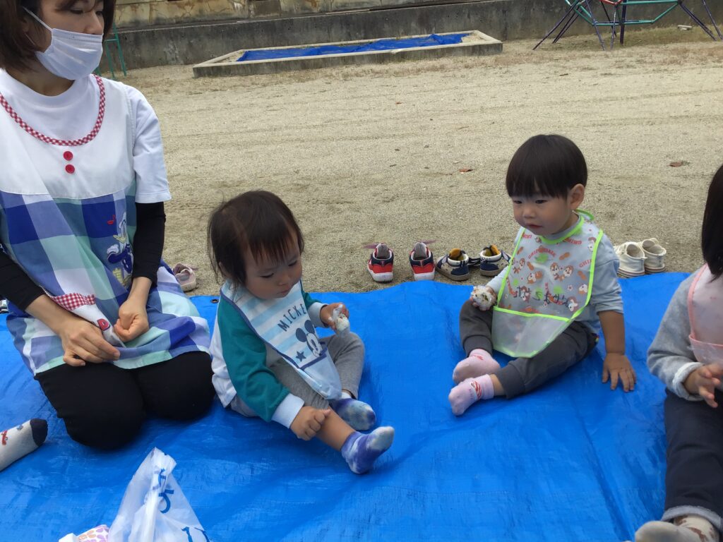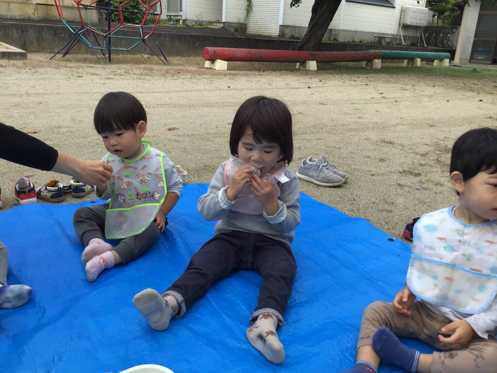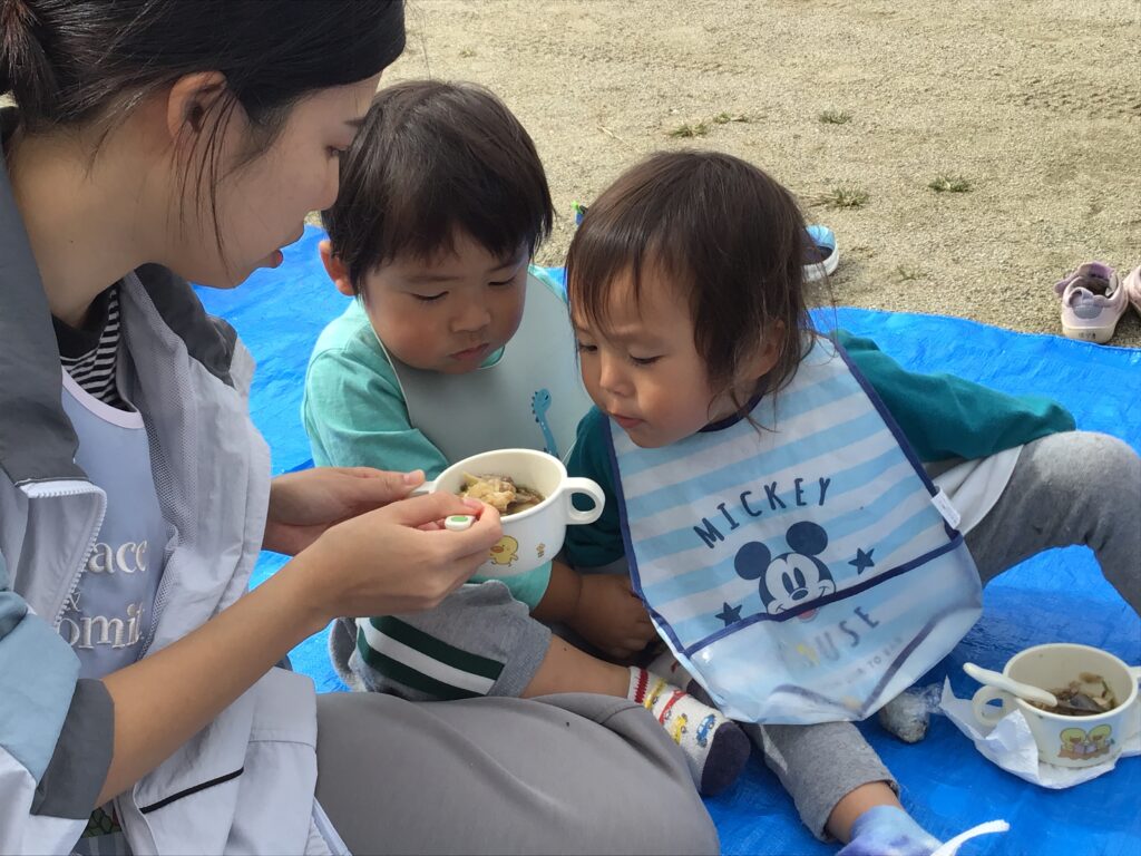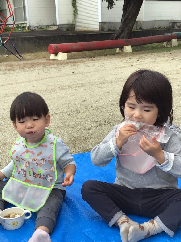おにぎりもパクパク!お外で食べるのは特別おいしいね!