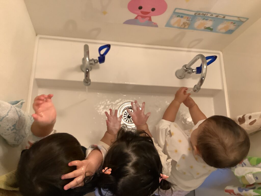 お外から帰ってきたらお手洗いを頑張っているいちご組さん。