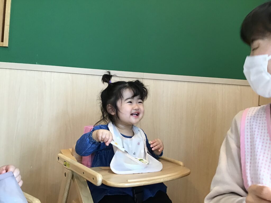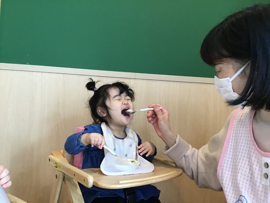 先生に食べさせてもらうが待ちきれず、椅子から出てこようとするお友達。