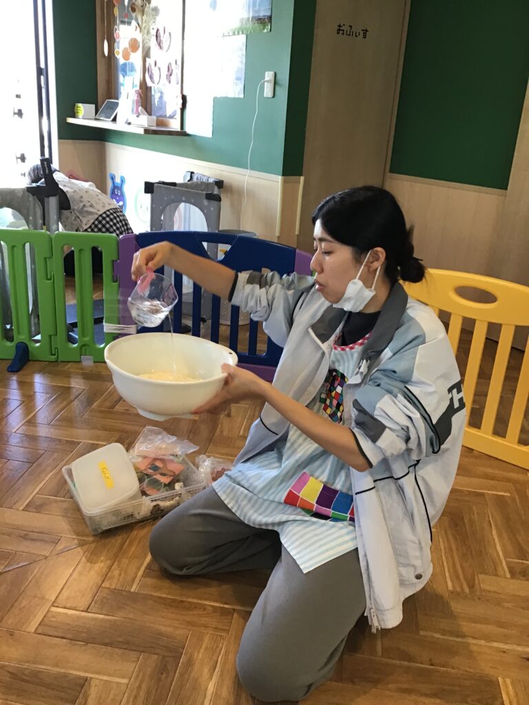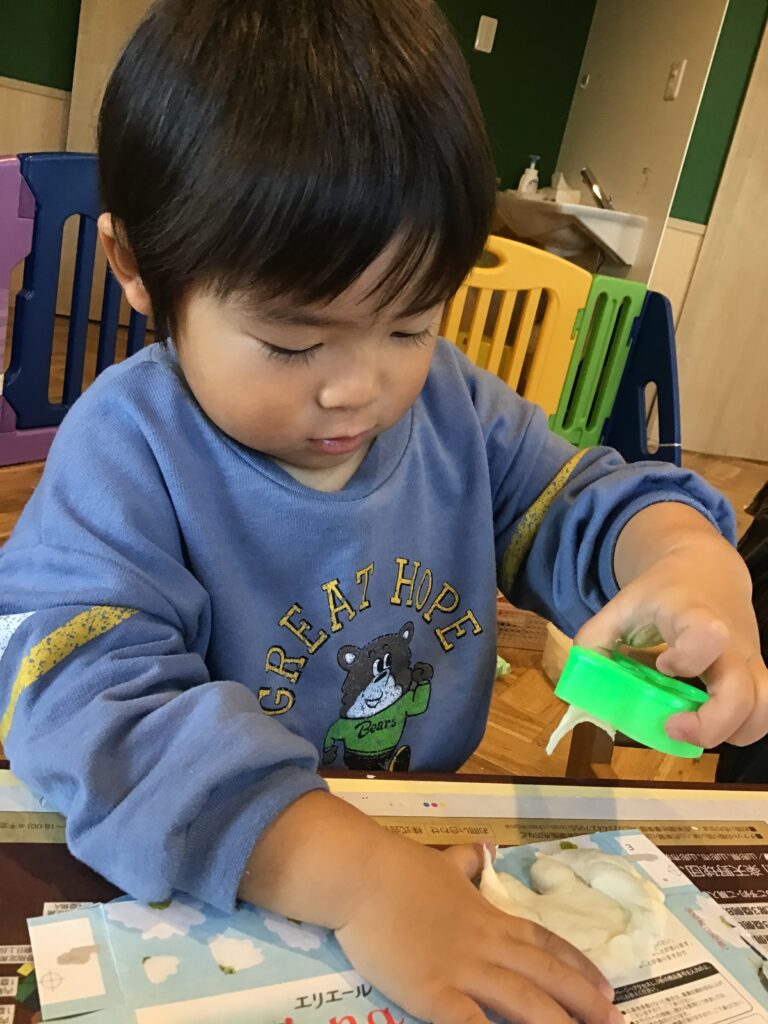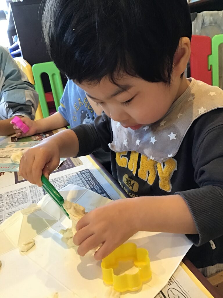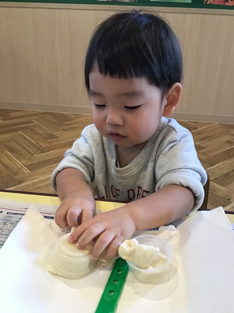 「何して遊ぼうかな?」と先生の声に「粘土したい~~」の子ども達のお話があり、今日は小麦粉で