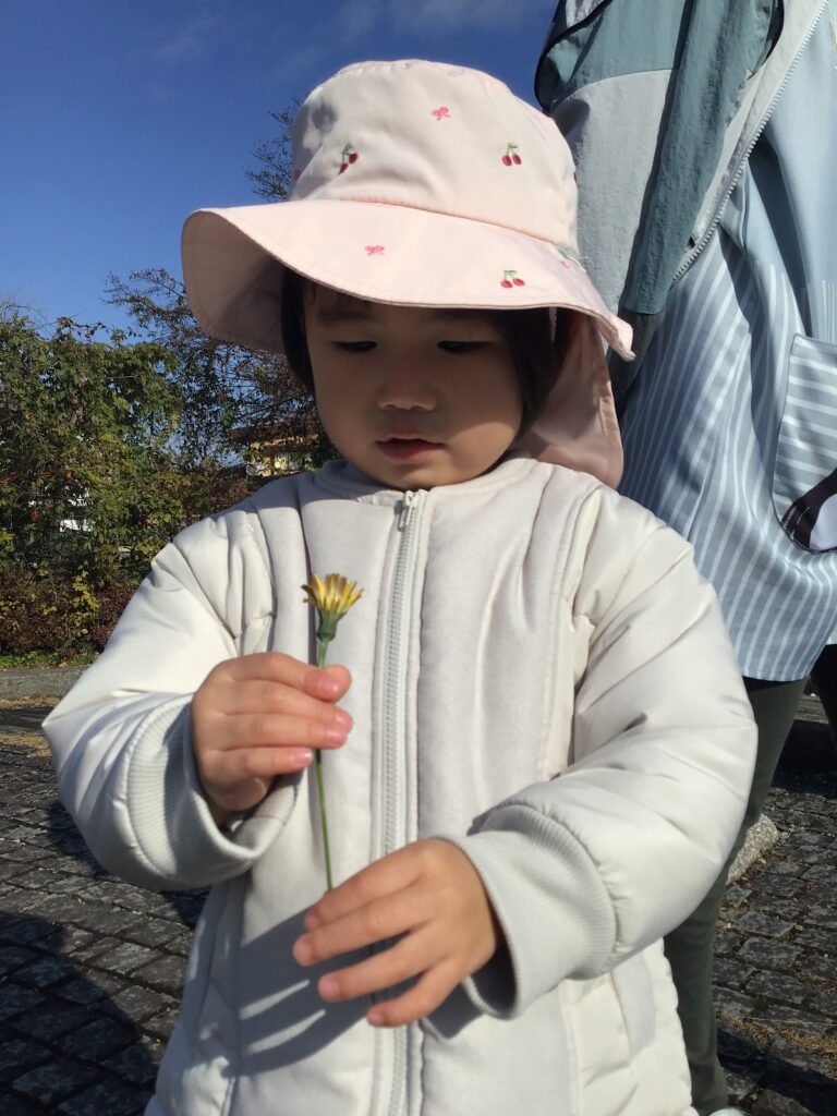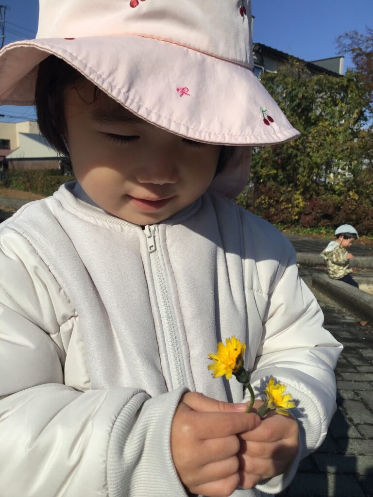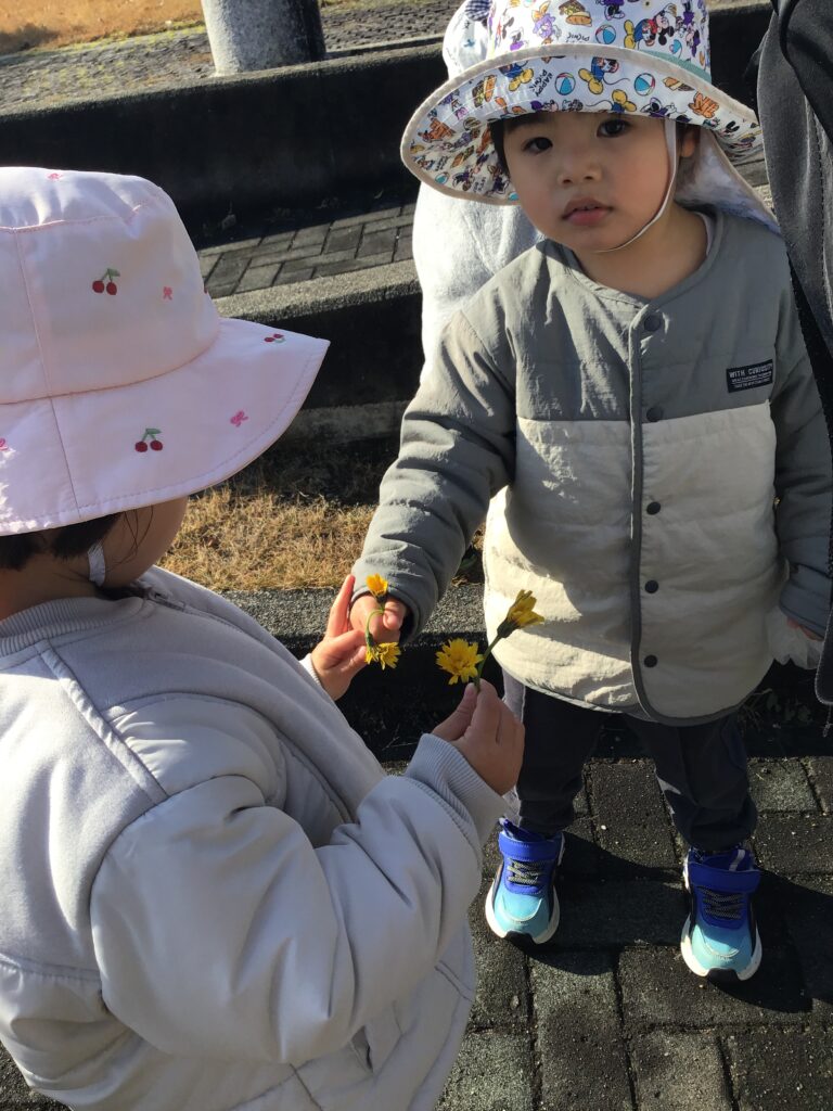 その中、ぶどう組のお友だちがお花を摘んできて「〇〇ちゃん、どうぞ」と渡してくれました。
