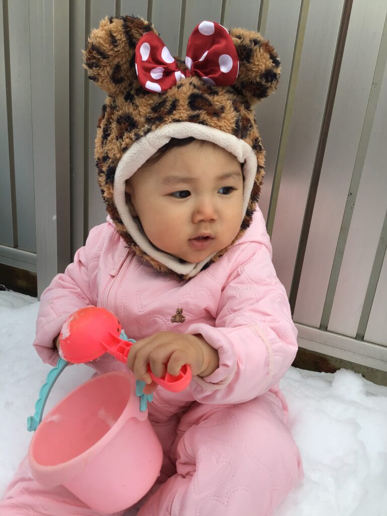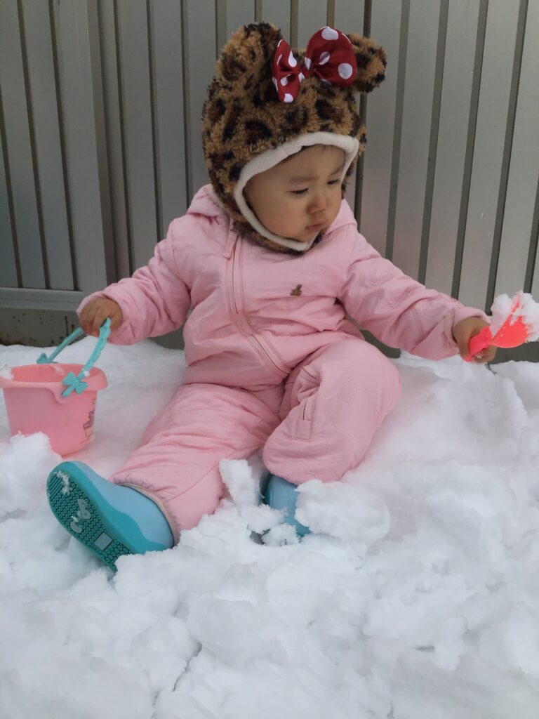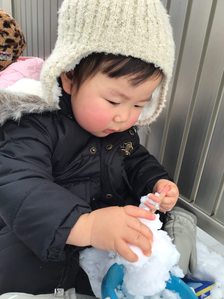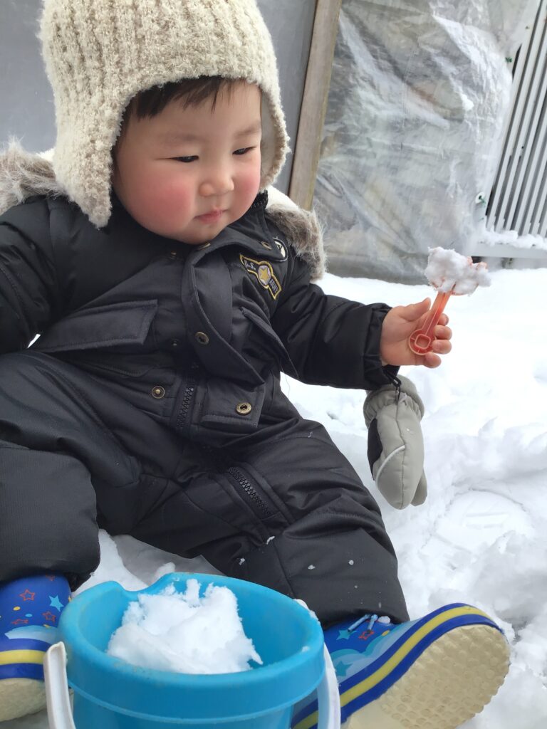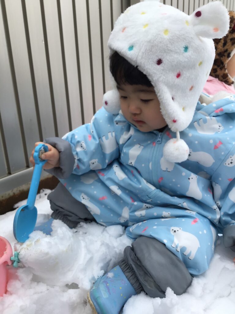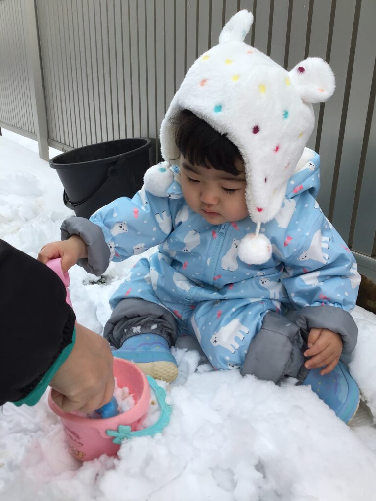 「雪遊びする人~~?」と聞くと「は~~~~い!!」と元気よく返事をしながら手を挙げてくれるいちご組さん。