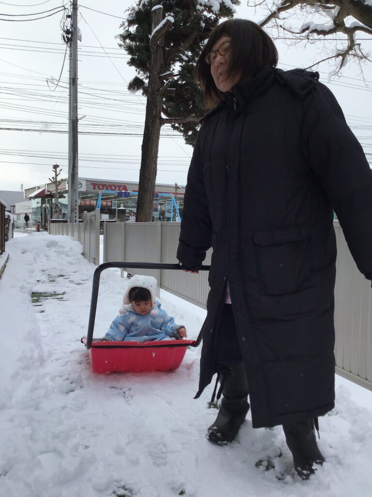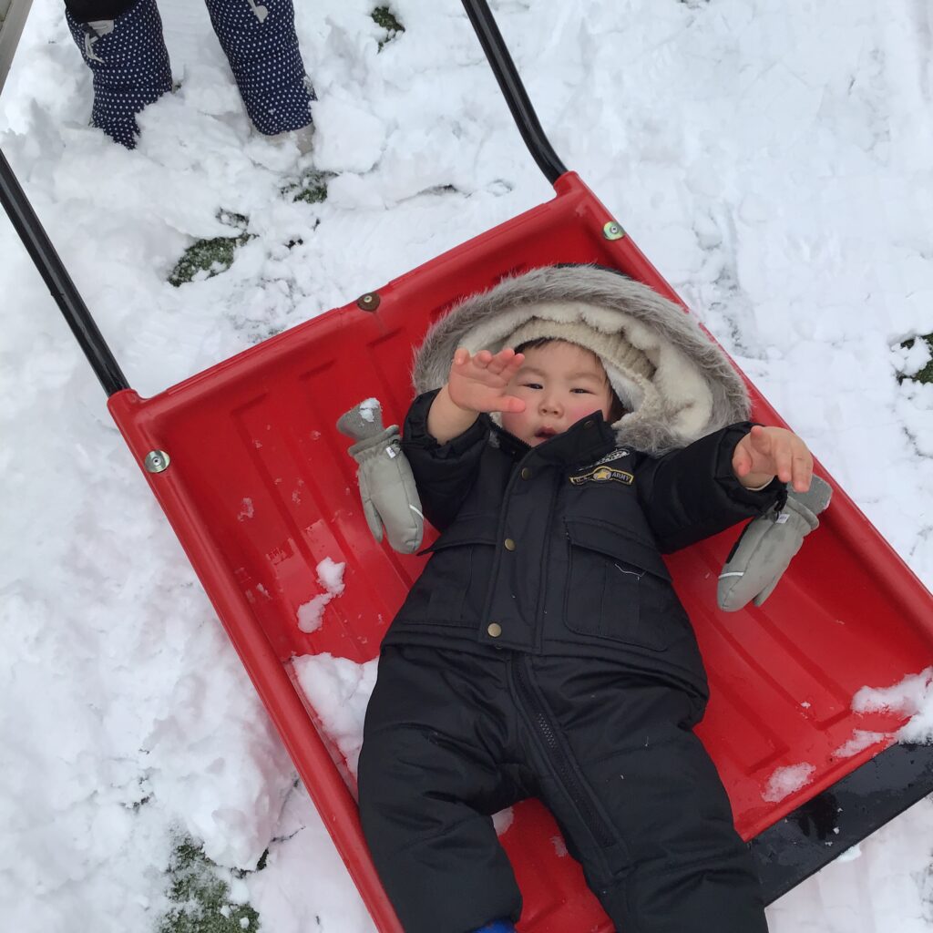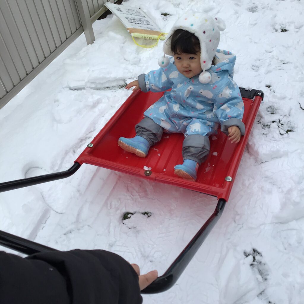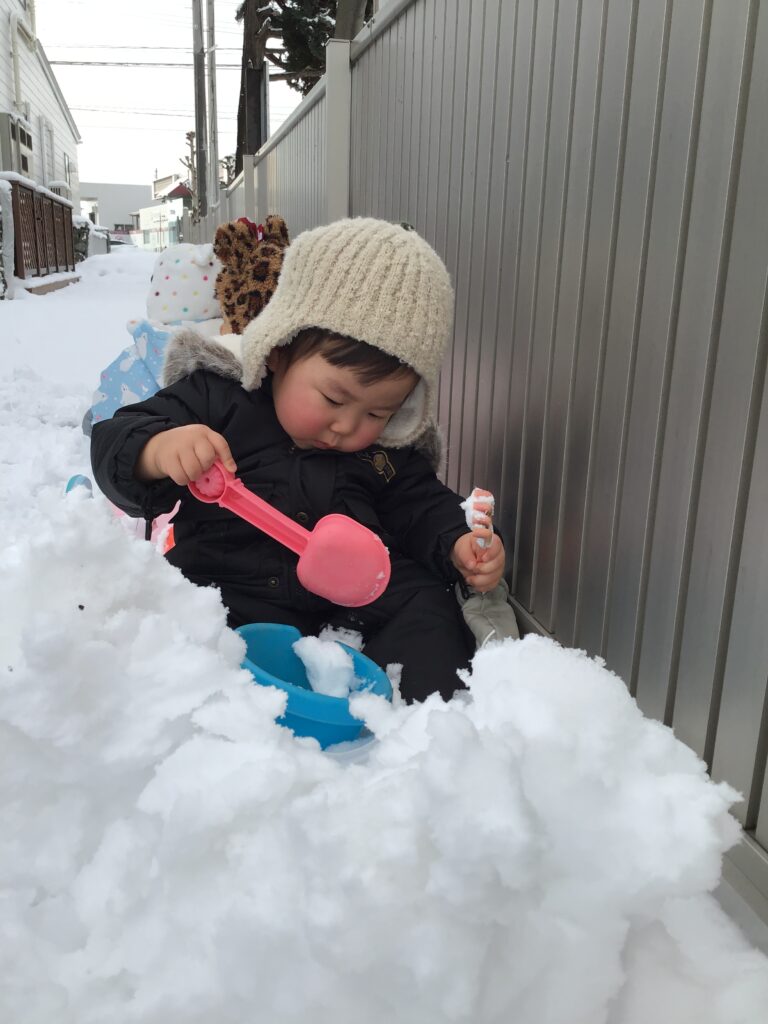 おもちゃを使ってクッキングをしたり、雪かきをしていた園長先生の応援をしたり、ママさんダンプでそり滑り・・・(#^^#)