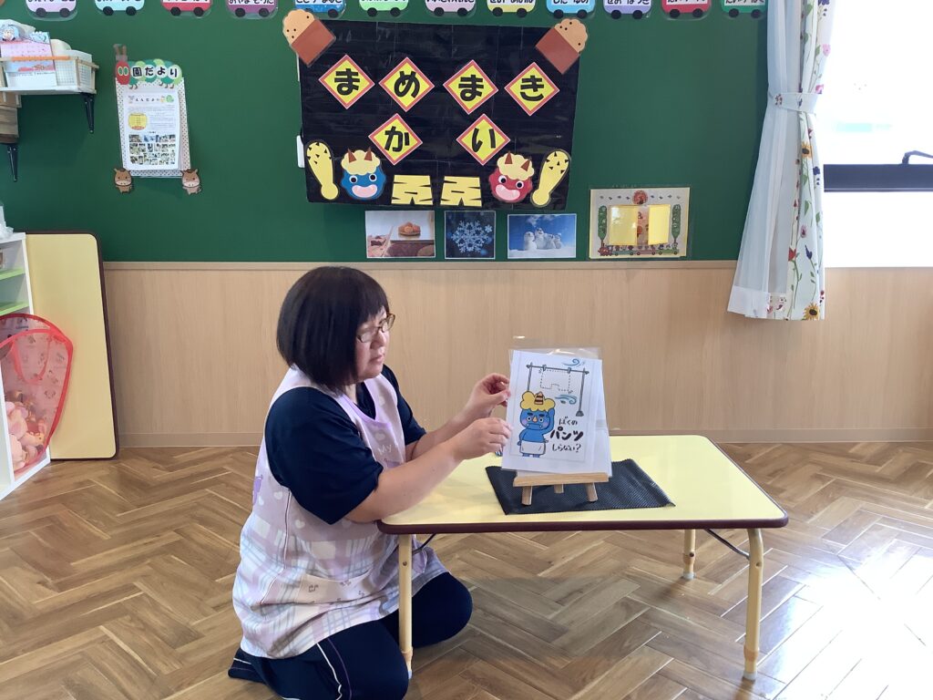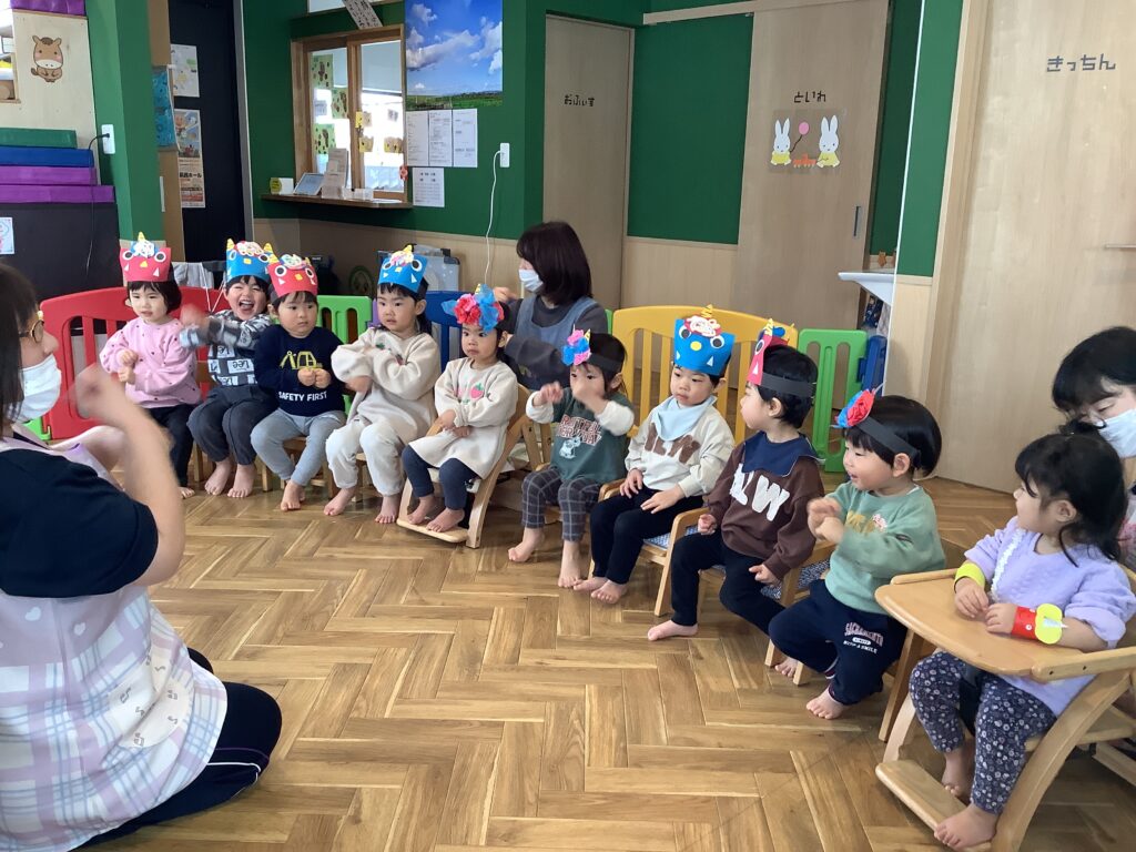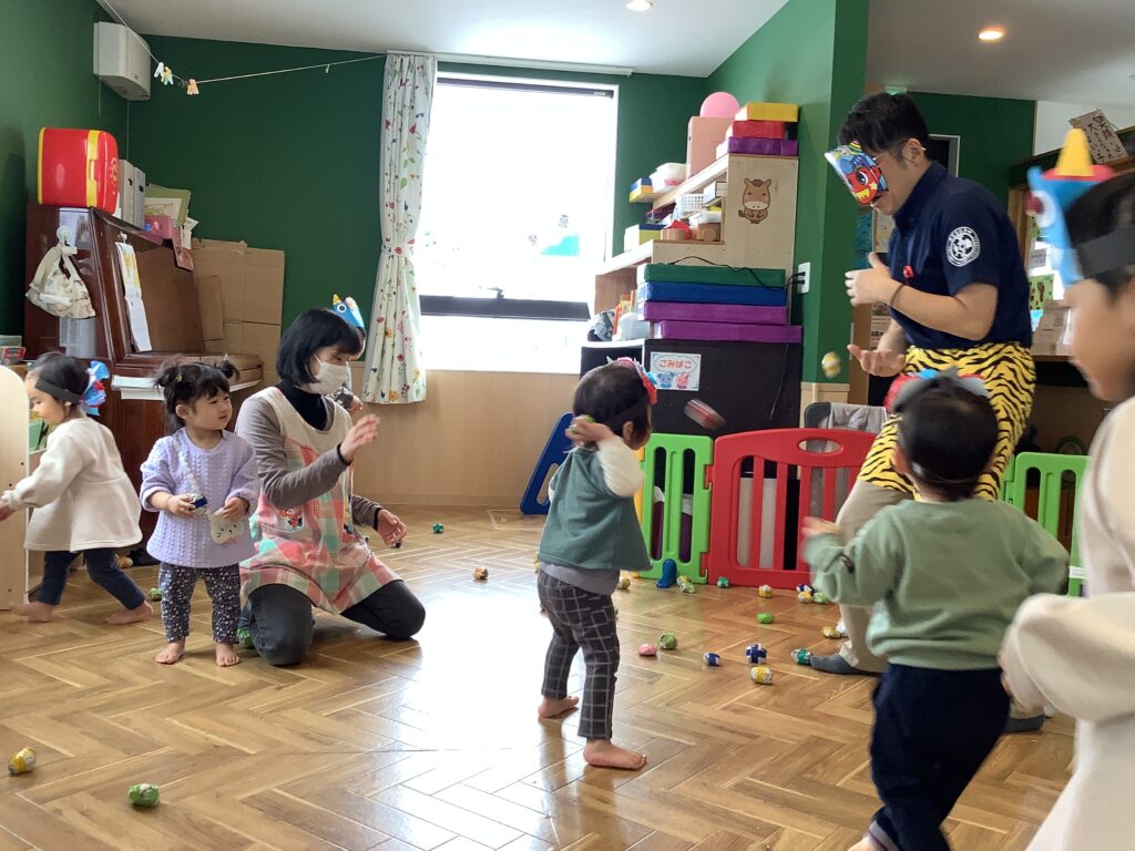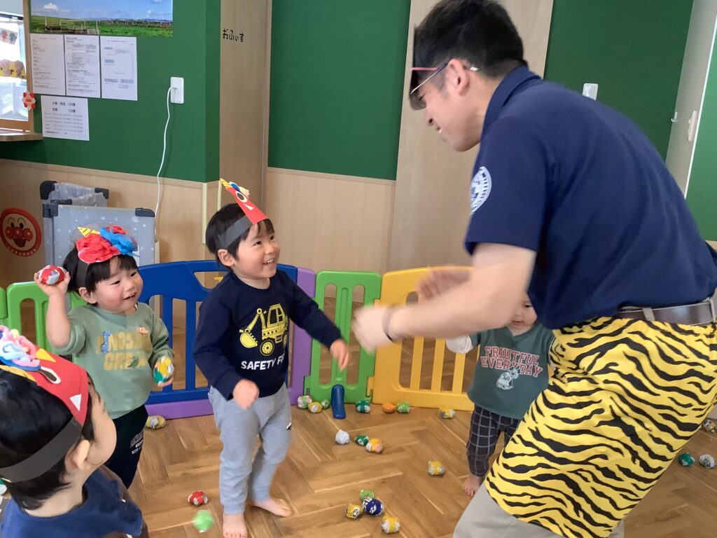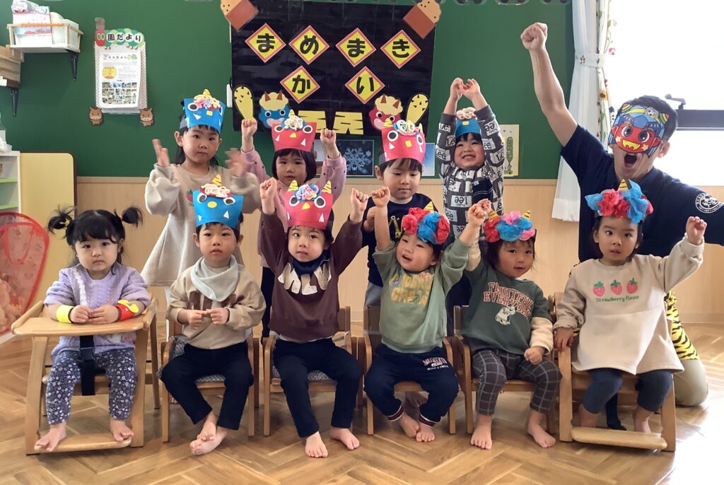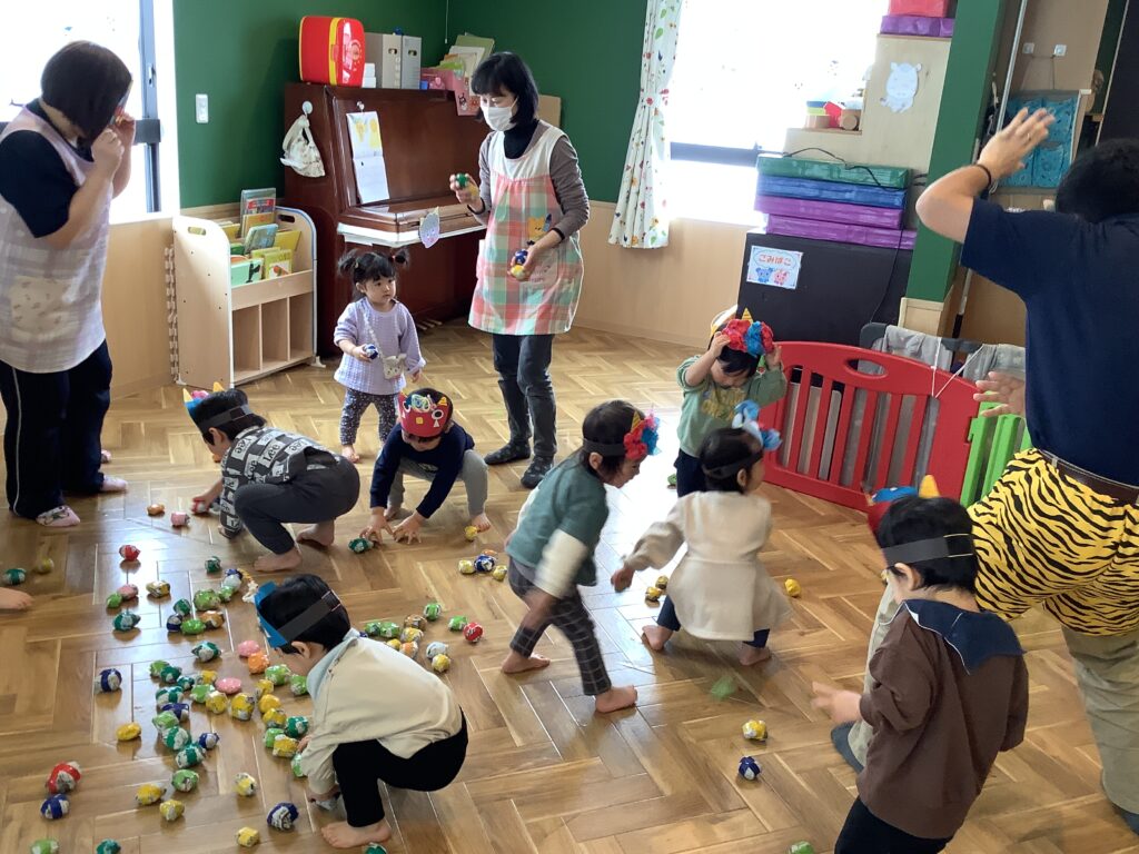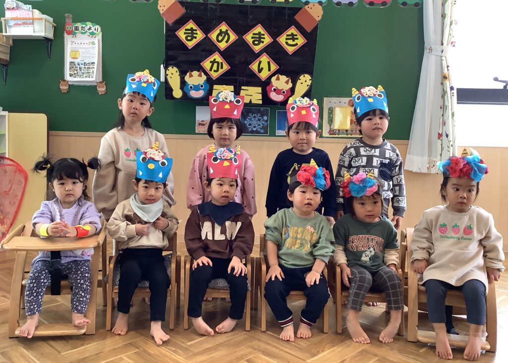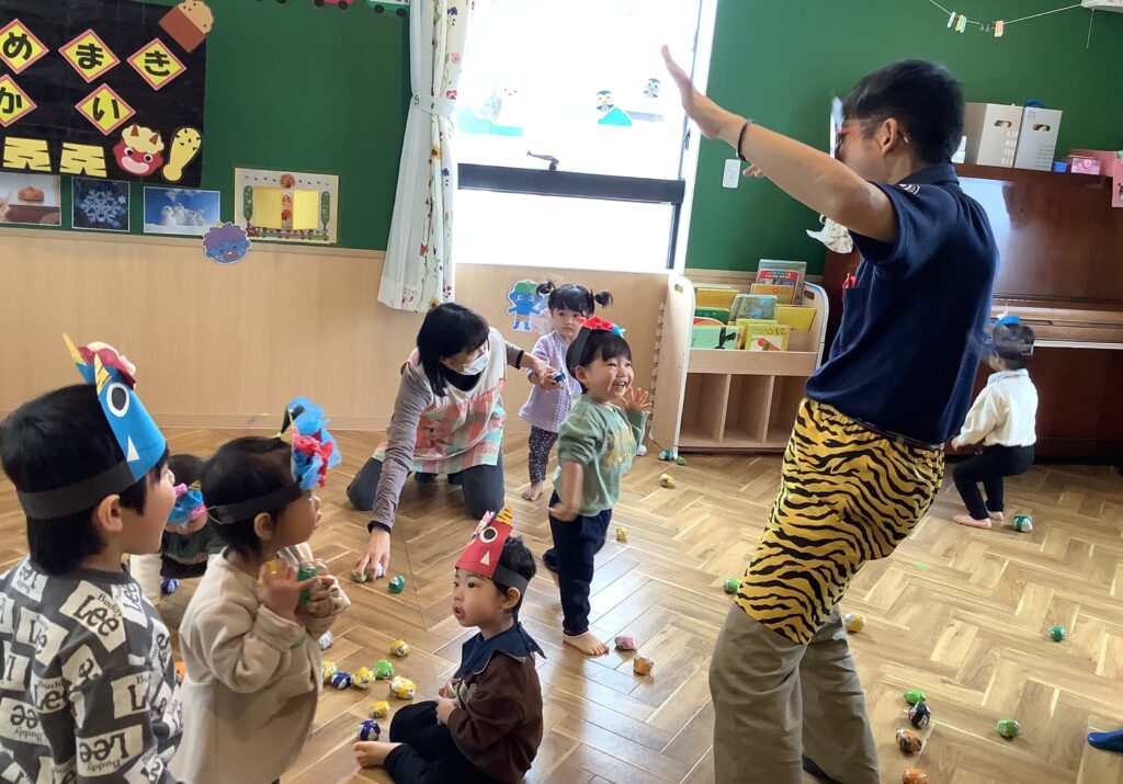 初めに保育士より「ぼくのパンツはどこ?」のお話を聞き、保育士の心の中にいる「泣き虫鬼」「怒りんぼ鬼」「意地悪鬼」「怠け鬼」をやっつけよう!と始まった豆まき。