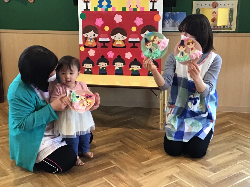 初めに保育士よりひな祭りの由来について話しを聞きました。聞いている子ども達のお顔は真剣そのものです(#^^#)