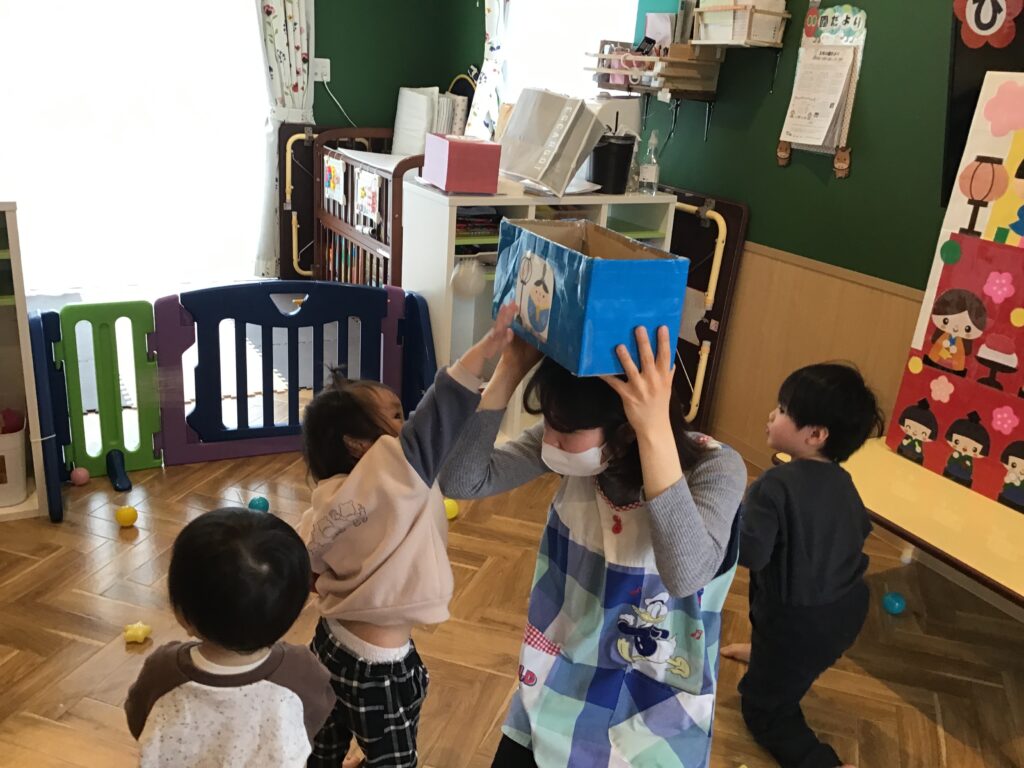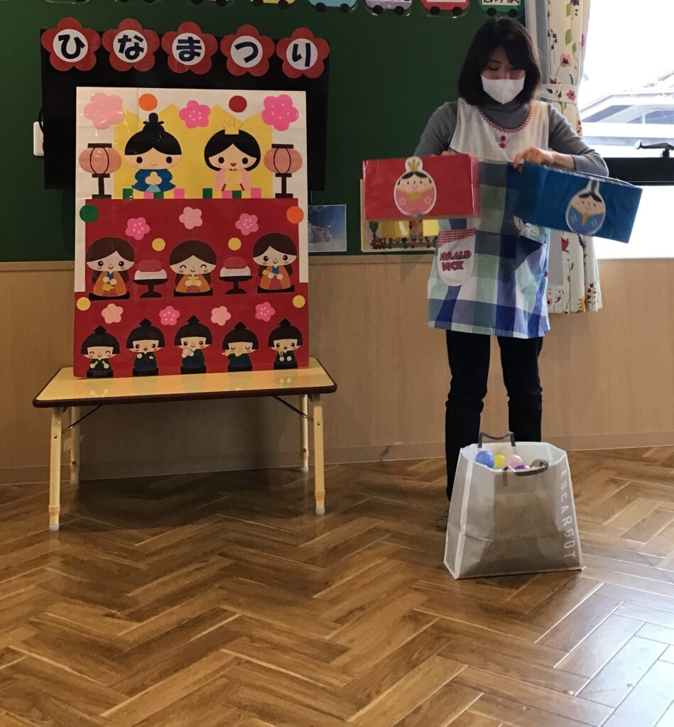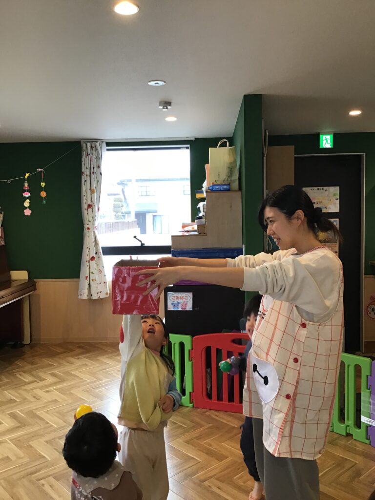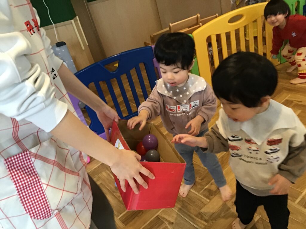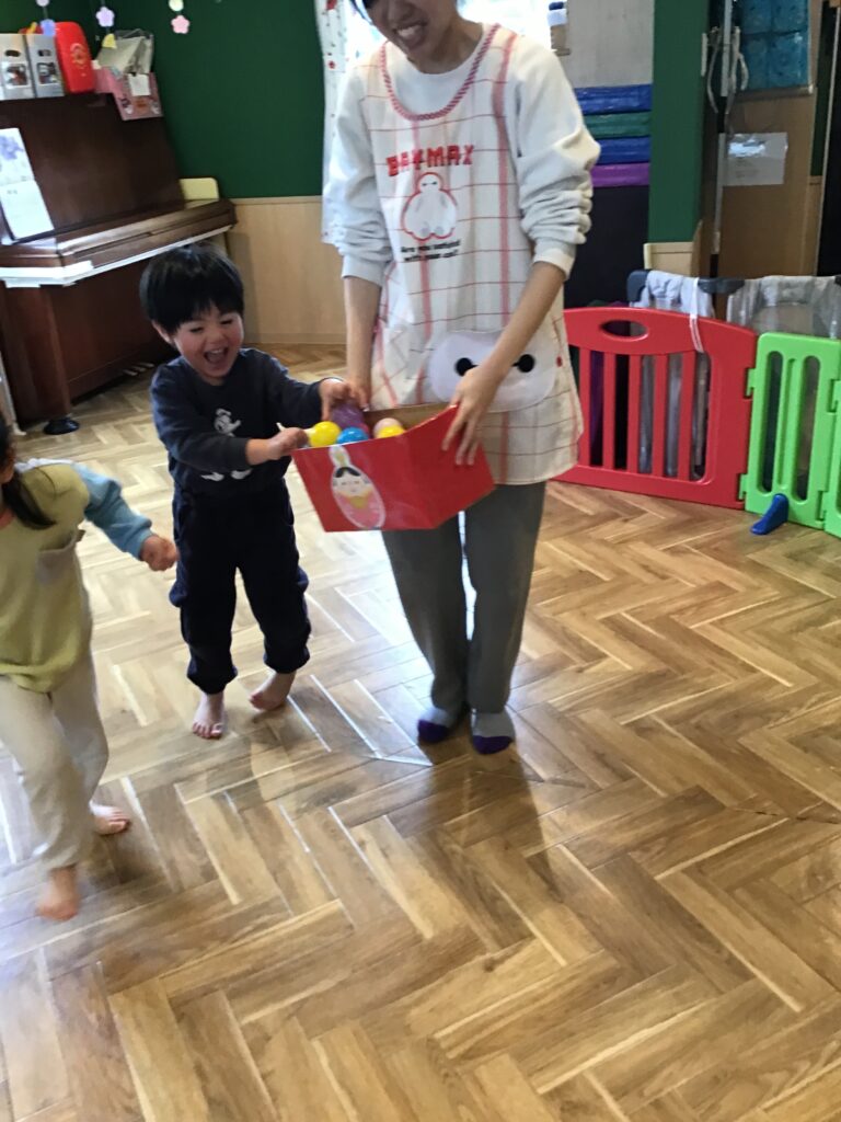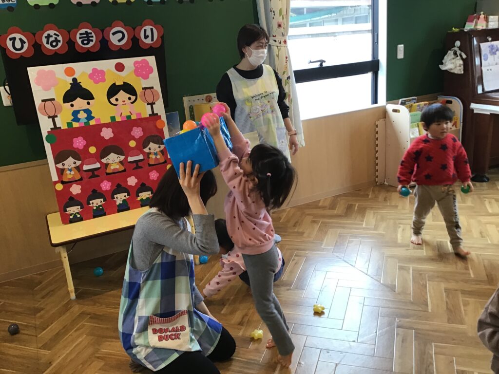 その後、ボールをひなあられに見立てて玉入れをしました。一生懸命ボールを箱に入れ、箱いっぱいになったひなあられはお雛様にあげました(^^♪